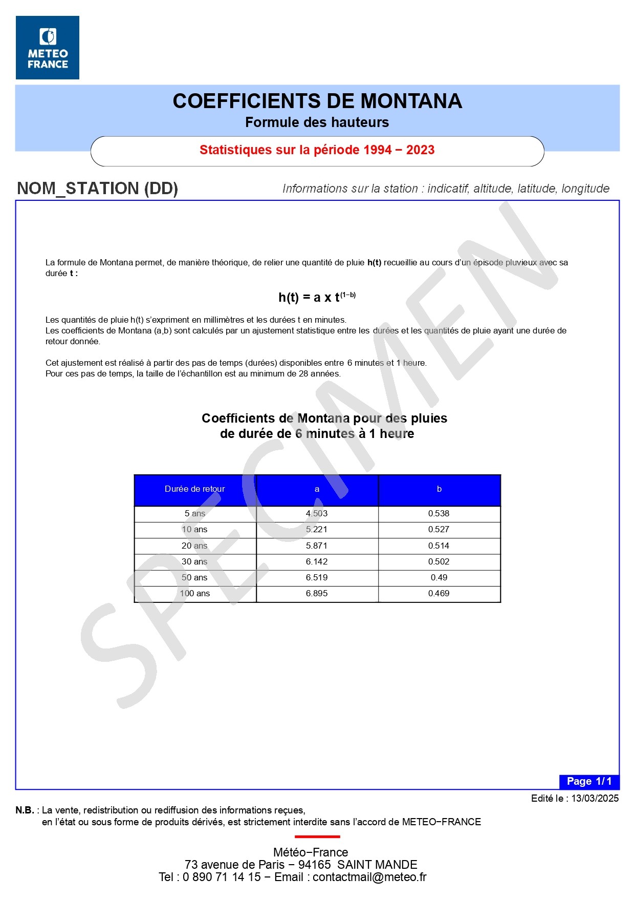 - Les coefficients de Montana calculés à partir des durées de retour de fortes précipitations s’appuient sur les mesures de pluviométrie du réseau d’observations synoptiques de Météo-France.