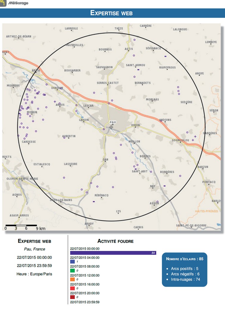 - La cartographie expertise est une restitution de l'activité orageuse sur un cercle de rayon paramétrable, centré sur un point donné (commune, adresse, coordonnées géographiques) et pour une période donnée.