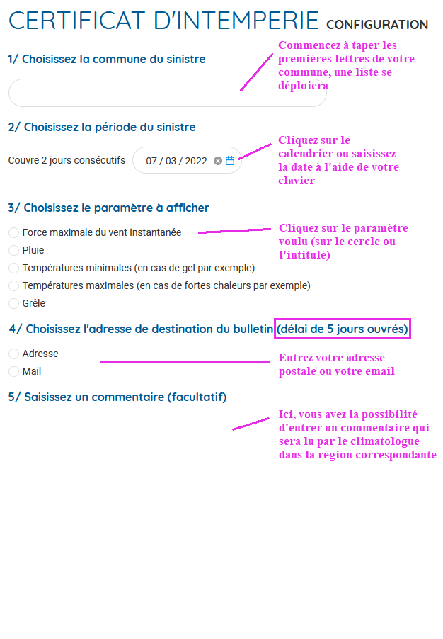 Si plusieurs paramètres météorologiques sont à l’origine des sinistres que vous avez constatés, surtout en cas de tempêtes ou d’orages, vous pouvez utiliser la rubrique commentaire pour expliciter davantage le sinistre constaté.