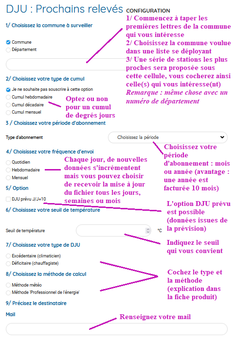 - En cas de doute sur la configuration de votre commande de DJU, une équipe de conseillers se tient à votre disposition pour répondre à toutes vos interrogations, par email ou par téléphone