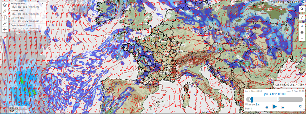 - Le menu possède des bornes qui permettent de choisir une période temporelle d'animation. Vous pourrez ainsi visualiser la prévision des vents sur votre zone d'intérêt.