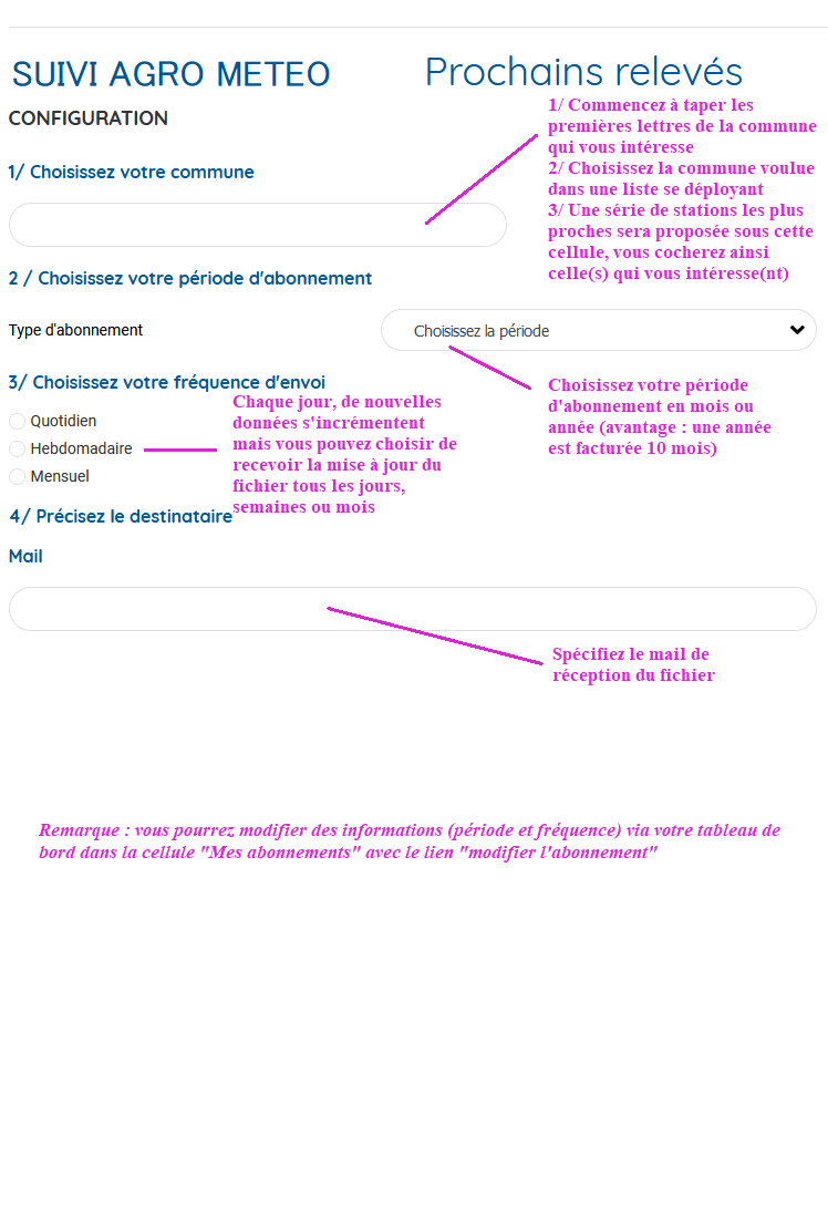 - Le Suivi Météorologique Quotidien Agrométéorologique prochains relevés correspond à un abonnement : vous recevez alors durant toute la durée de votre abonnement les données météo du mois en cours, mises à jour quotidiennement avec les valeurs de la veille. Vous choisirez une fréquence d'envoi quotidienne, hebdomadaire ou mensuelle. Vous pouvez vous abonner pour une période de 1 mois à 1 an.