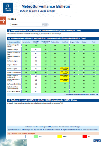 - It summarizes the weather situation, the trend over the next few days and summarizes the weather risks in a table. One line per monitored risk to which is associated a level (green, yellow, orange or red) for each zone.