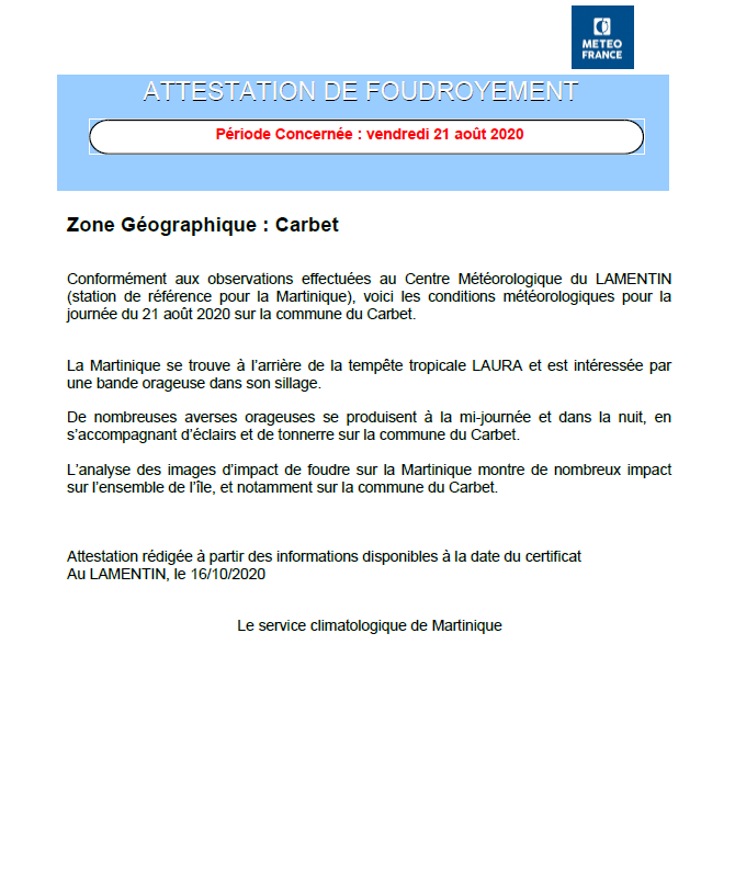 - L’attestation de foudroiement pour l'Outre-Mer ou certificat d'intempérie Orage/Foudroiement fournie par Météo-France est un document officiel reconnu par toutes les compagnies d’assurance dans le cadre de dossiers de remboursements de dégâts liés à la foudre. Ce document détaille les conditions météorologiques précisant les phénomènes orageux (et les aspects associés comme la foudre) survenus un jour précis et qui ont pu occasionner des dommages, des dégâts matériels, un sinistre ou un accident.