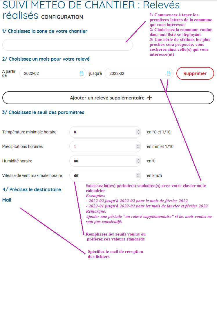- Le Suivi Météorologique de Chantier Outre-Mer relevés réalisés correspond aux produits archivés. Vous achetez alors les données météo d’un ou plusieurs mois complets parmi les 5 dernières années.